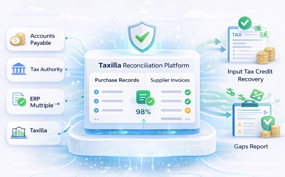 Automated matching of purchase and sales data against supplier invoices, ledger matching to detect VAT mismatches and close input tax credit gaps.