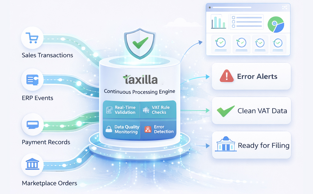 Unlike batch systems, Taxilla processes transactions continuously - so compliance gaps are identified and remediated in real time, not at period end.