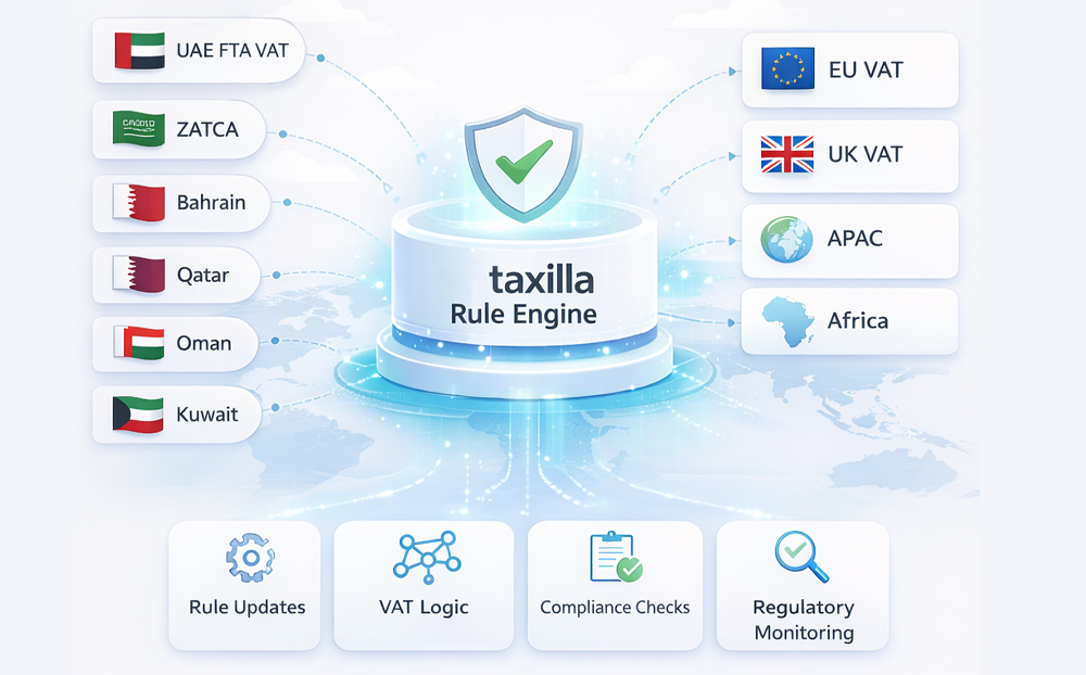 UAE FTA VAT ruleset built-in as standard, plus 200+ pre-configured VAT rulesets across GCC (KSA ZATCA, Bahrain, Qatar, Oman, Kuwait), EU, UK, APAC, and Africa. Rulesets are maintained by Taxilla's regulatory team - so your team doesn't have to.